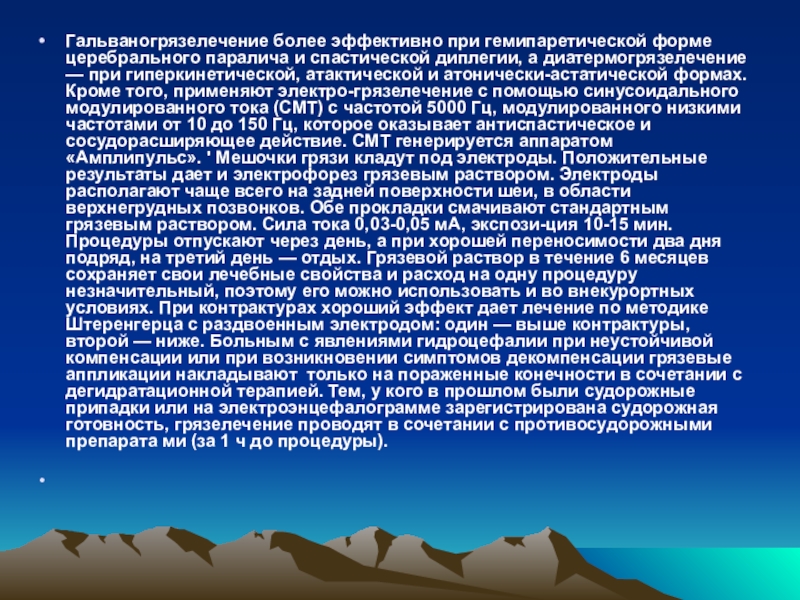 Слайд 7Гальваногрязелечение более эффективно при гемипаретической форме церебрального паралича и спастической диплегии,