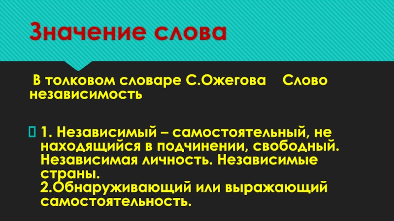 Независимый – самостоятельный, не находящийся в подчинении, свободный. Независимая личность. Независимые страны.