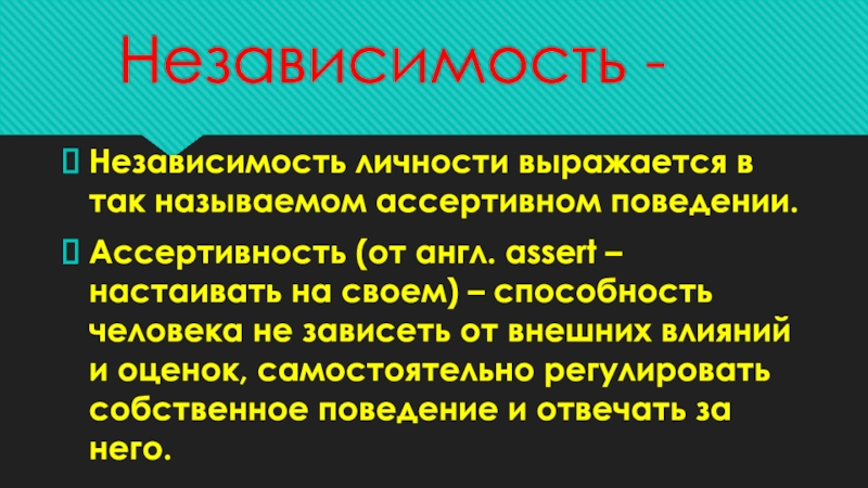 Ассертивность (от англ. assert – настаивать на своем) – способность человека не зависеть от внешних влияний и оценок, самостоятельно регулировать собственное поведение и отвечать за него.