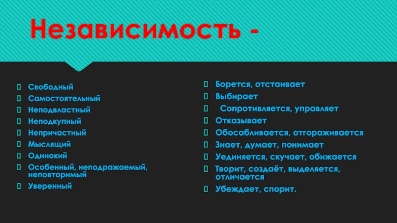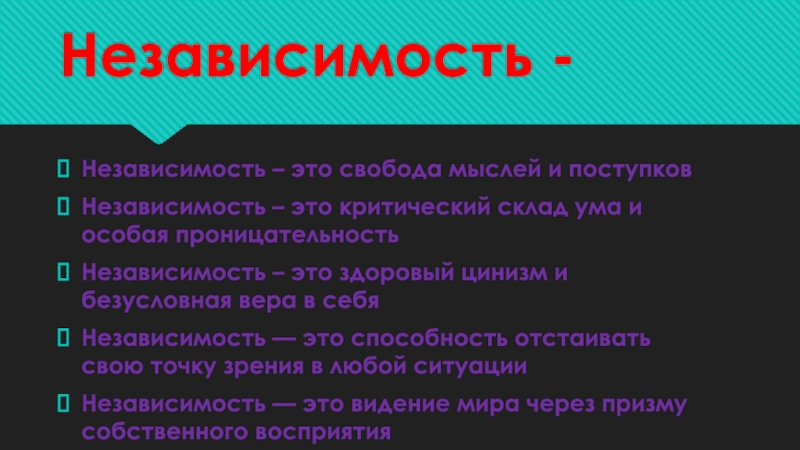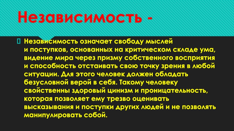 Независимость означает свободу мыслей и поступков, основанных на критическом складе ума, видение