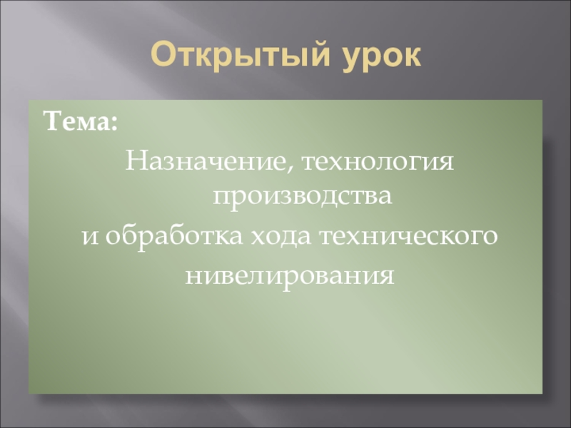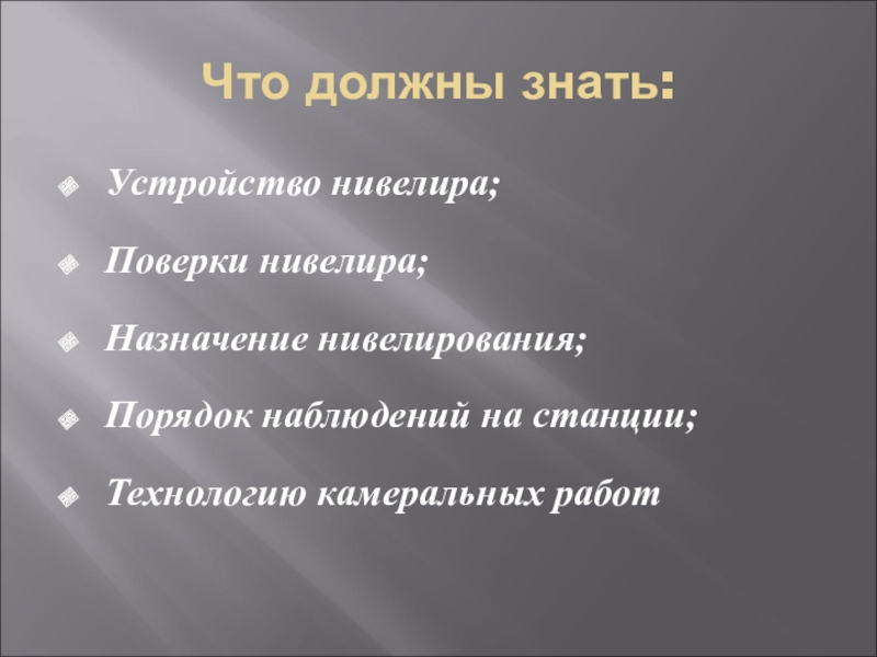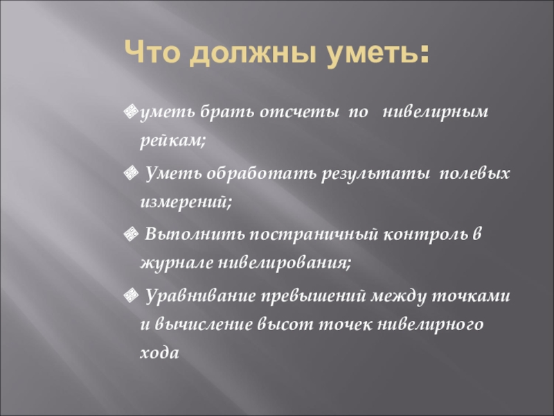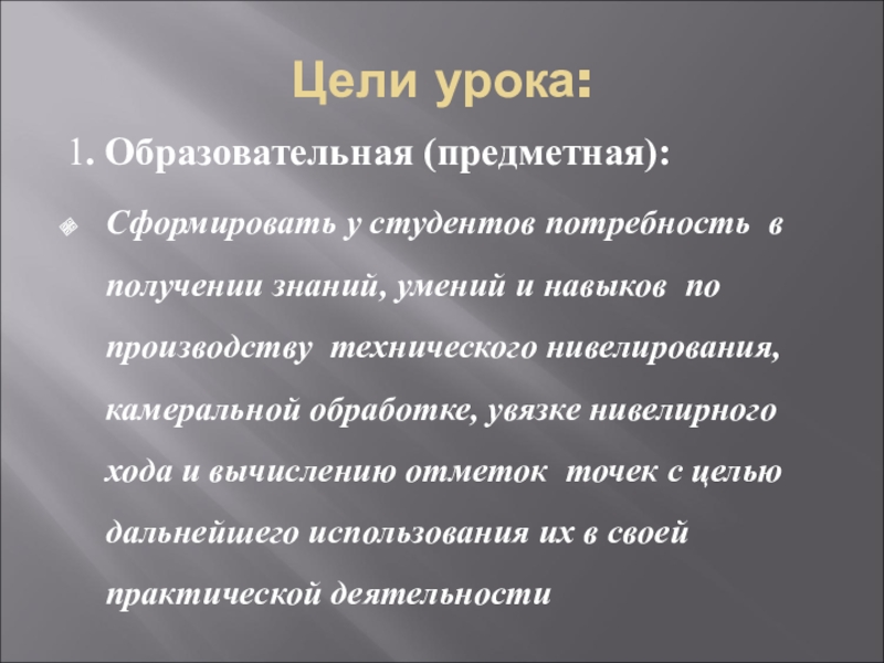 и навыков по производству технического нивелирования, камеральной обработке, увязке нивелирного хода и вычислению отметок точек с целью дальнейшего использования их в своей практической деятельности