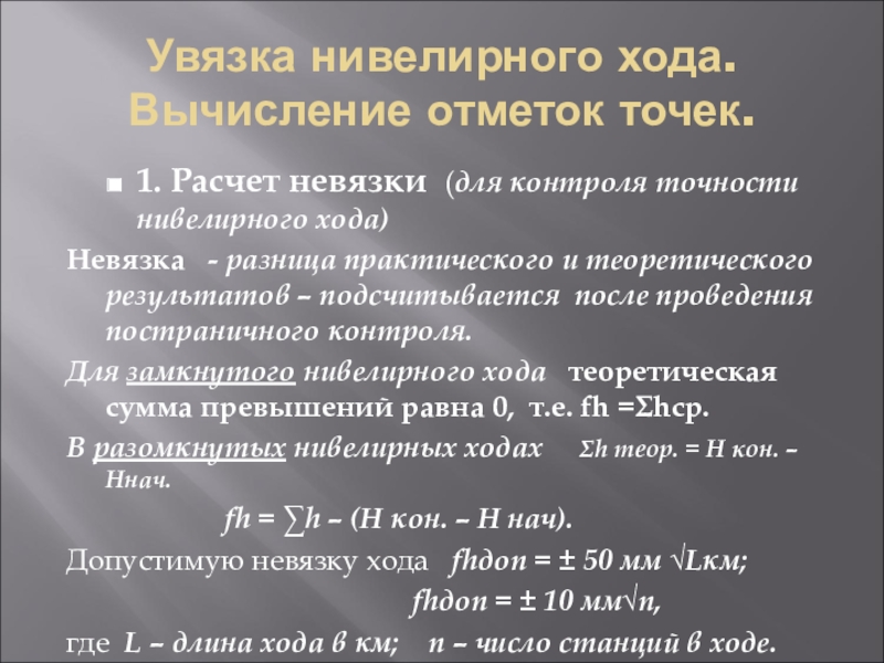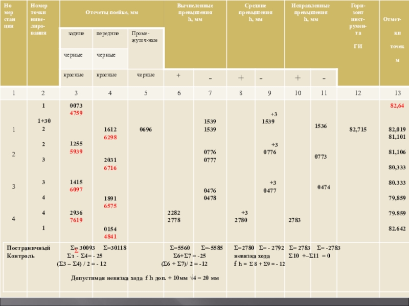 Допустимую невязку хода fhдоп = ± 50 мм √Lкм;