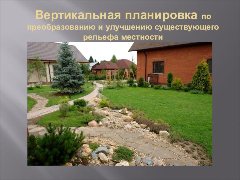 Слайд 20Вертикальная планировка по преобразованию и улучшению существующего рельефа местности