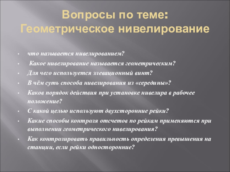 Слайд 11Вопросы по теме: Геометрическое нивелирование