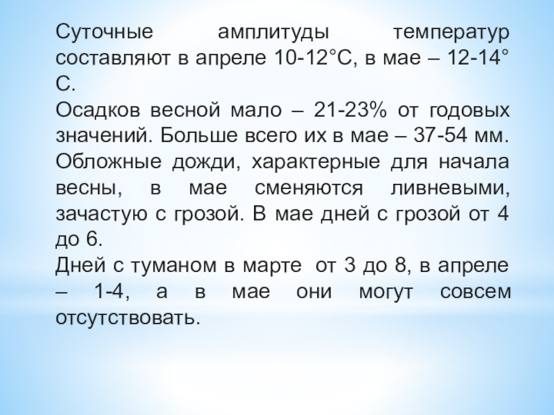 Слайд 14Суточные амплитуды температур составляют в апреле 10-12°С, в мае – 12-14°С.