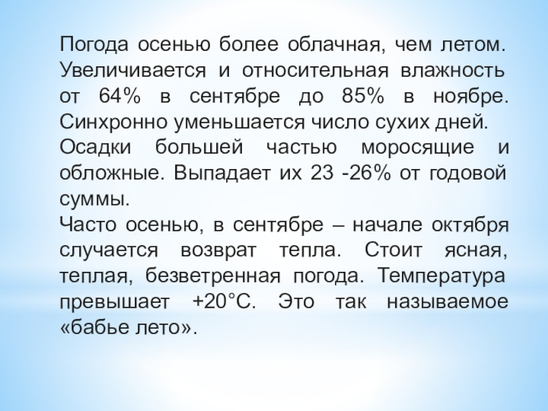 Слайд 21Погода осенью более облачная, чем летом. Увеличивается и относительная влажность от