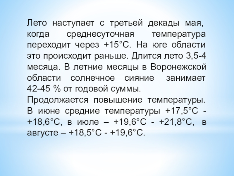 +15°С. На юге области это происходит раньше. Длится лето 3,5-4 месяца. В летние месяцы в Воронежской области солнечное сияние занимает 42-45 % от годовой суммы.