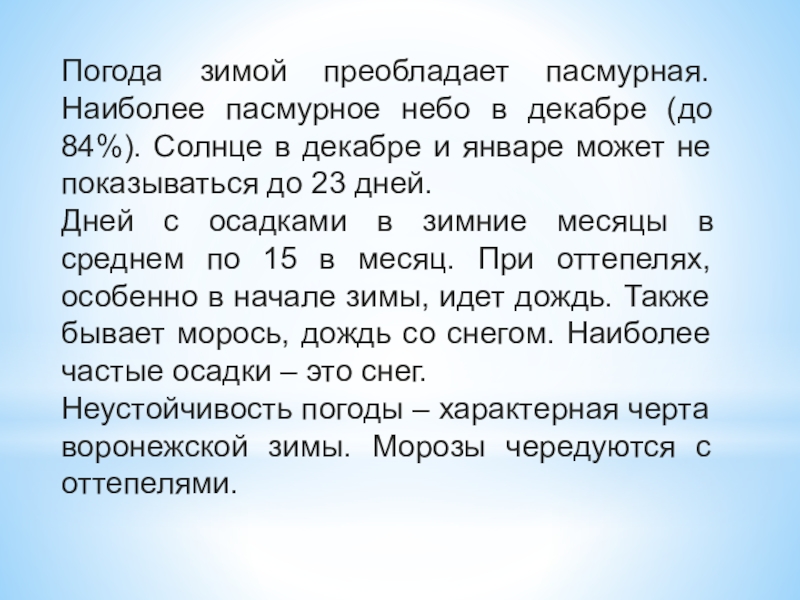 Слайд 10Погода зимой преобладает пасмурная. Наиболее пасмурное небо в декабре (до 84%).