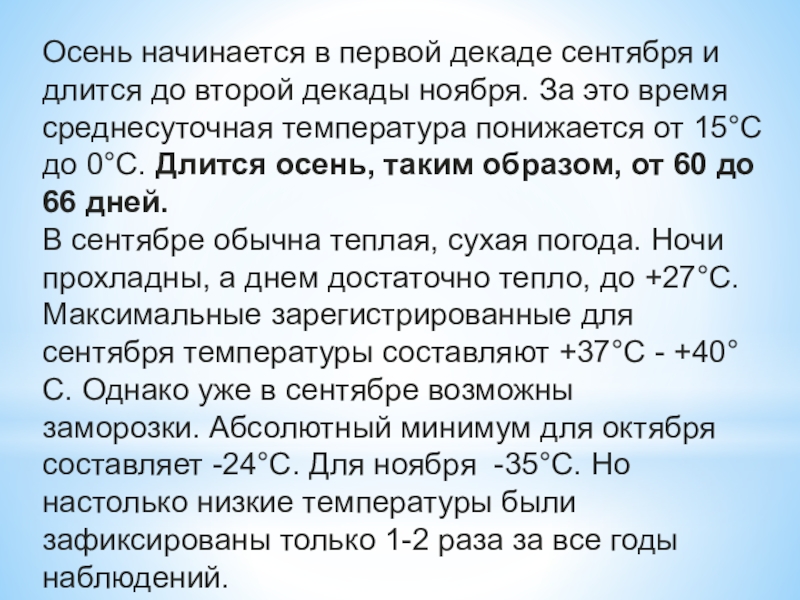 Слайд 20Осень начинается в первой декаде сентября и длится до второй декады