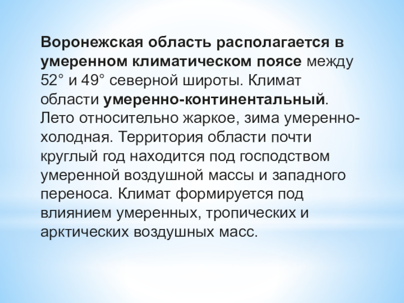 Слайд 2Воронежская область располагается в умеренном климатическом поясе между 52° и 49° северной