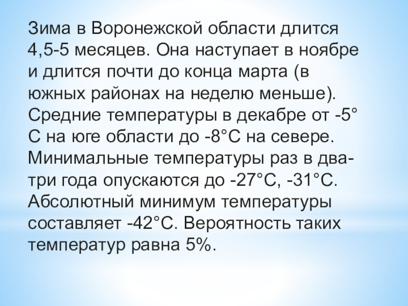Слайд 9Зима в Воронежской области длится 4,5-5 месяцев. Она наступает в ноябре