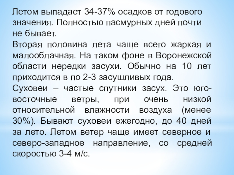 Слайд 18Летом выпадает 34-37% осадков от годового значения. Полностью пасмурных дней почти