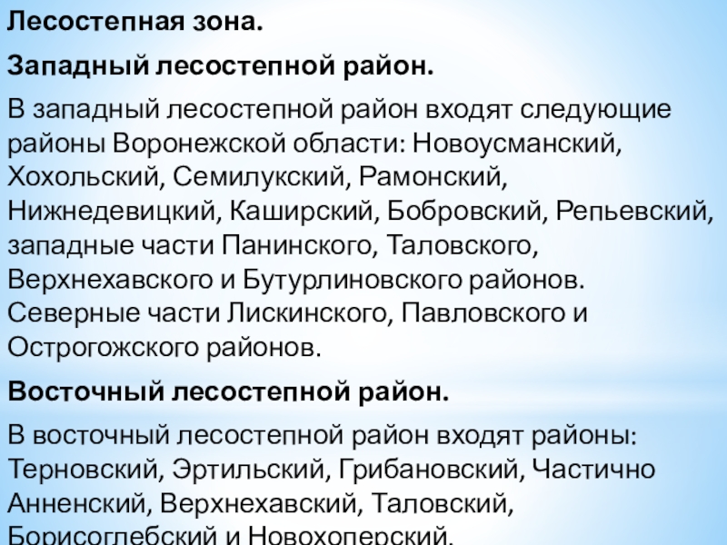 В восточный лесостепной район входят районы: Терновский, Эртильский, Грибановский, Частично Анненский, Верхнехавский, Таловский, Борисоглебский и Новохоперский.