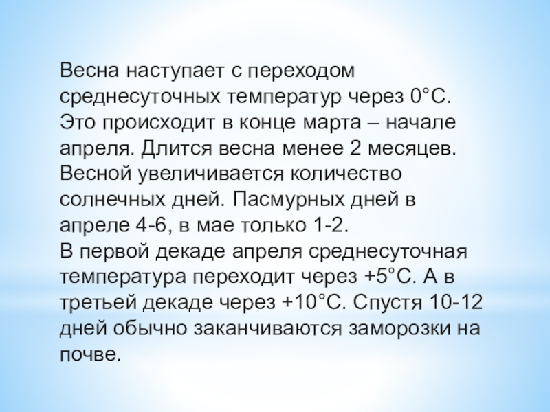 Слайд 13Весна наступает с переходом среднесуточных температур через 0°С. Это происходит в