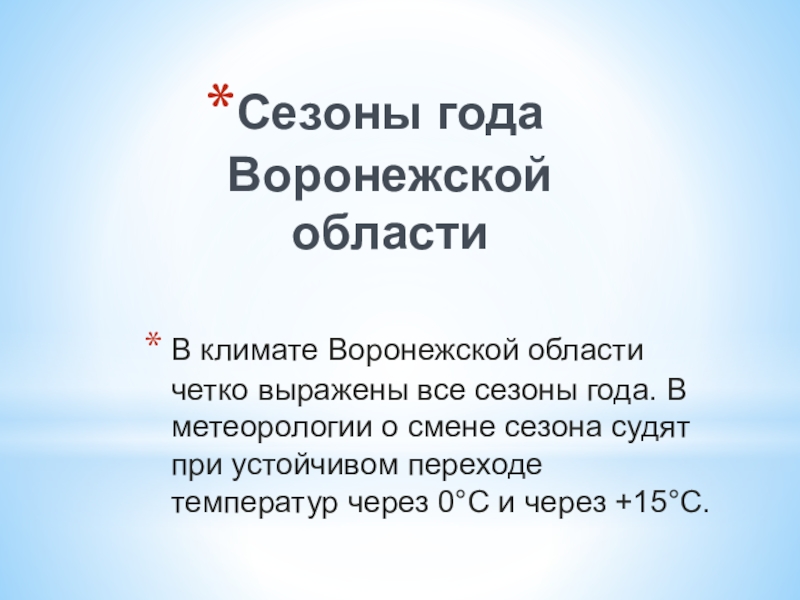 Слайд 7В климате Воронежской области четко выражены все сезоны года. В метеорологии