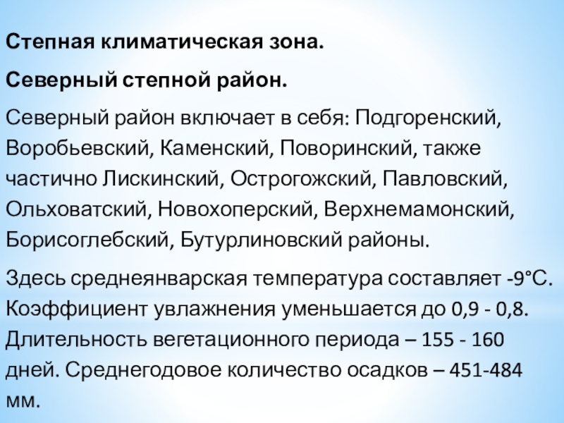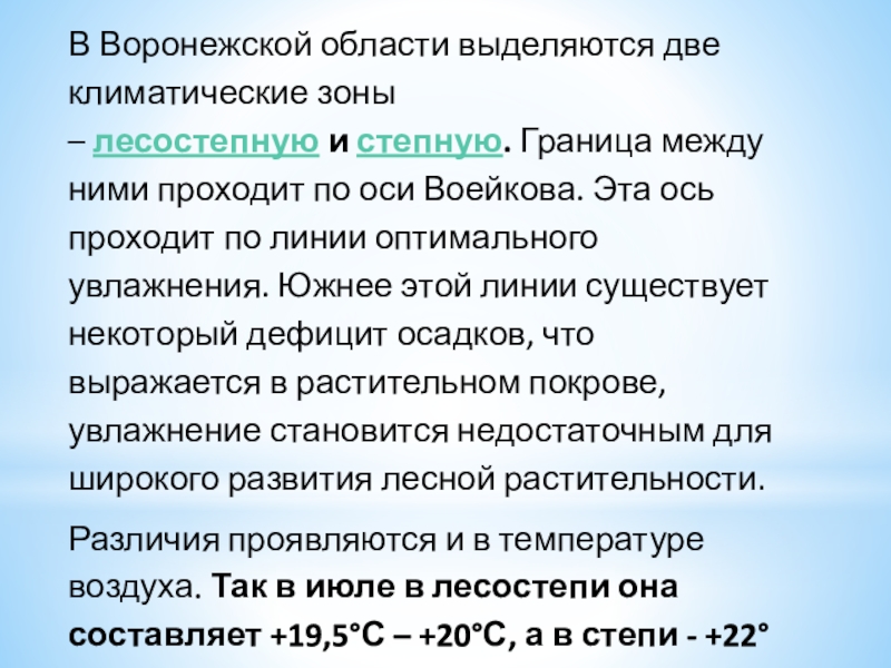 Слайд 25В Воронежской области выделяются две климатические зоны – лесостепную и степную. Граница между ними