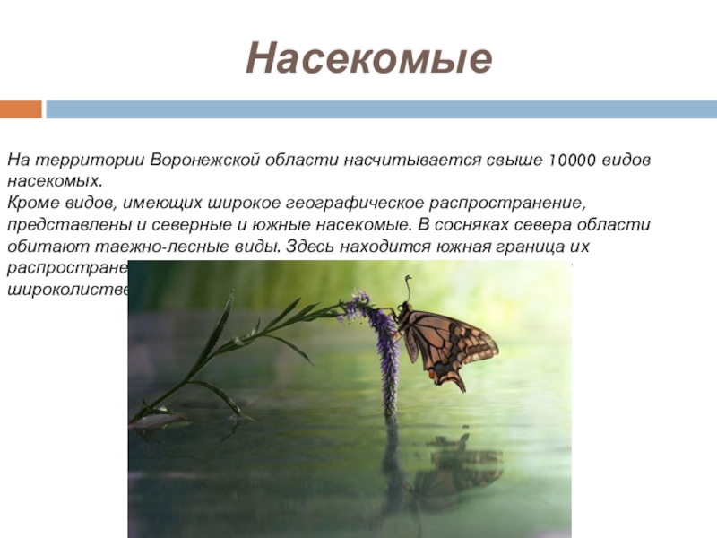 НасекомыеНа территории Воронежской области насчитывается свыше 10000 видов насекомых.Кроме видов, имеющих широкое географическое распространение, представлены и северные