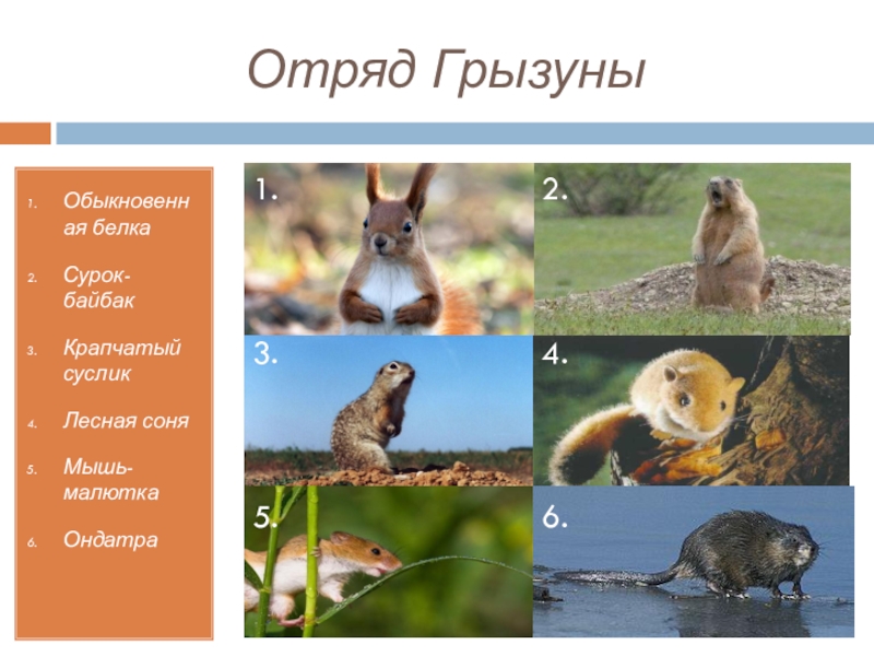 Отряд ГрызуныОбыкновенная белкаСурок-байбакКрапчатый сусликЛесная соняМышь-малюткаОндатра1.3.5.2.4.6.