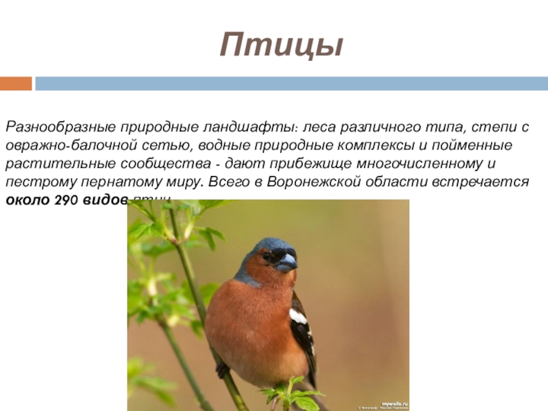 ПтицыРазнообразные природные ландшафты: леса различного типа, степи с овражно-балочной сетью, водные природные комплексы и пойменные растительные сообщества - дают прибежище многочисленному и пестрому пернатому миру. Всего в Воронежской области встречается около 290 видов птиц.