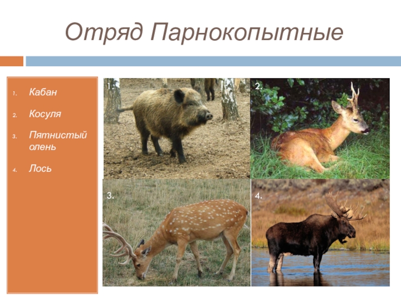 Отряд ПарнокопытныеКабанКосуляПятнистый оленьЛось1.3.2.4.