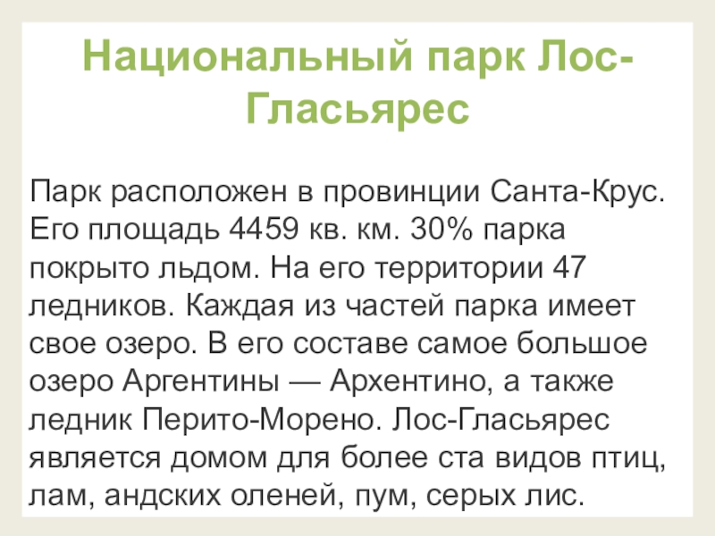 км. 30% парка покрыто льдом. На его территории 47 ледников. Каждая из частей парка имеет свое озеро. В его составе самое большое озеро Аргентины — Архентино, а также ледник Перито-Морено. Лос-Гласьярес является домом для более ста видов птиц, лам, андских оленей, пум, серых лис.