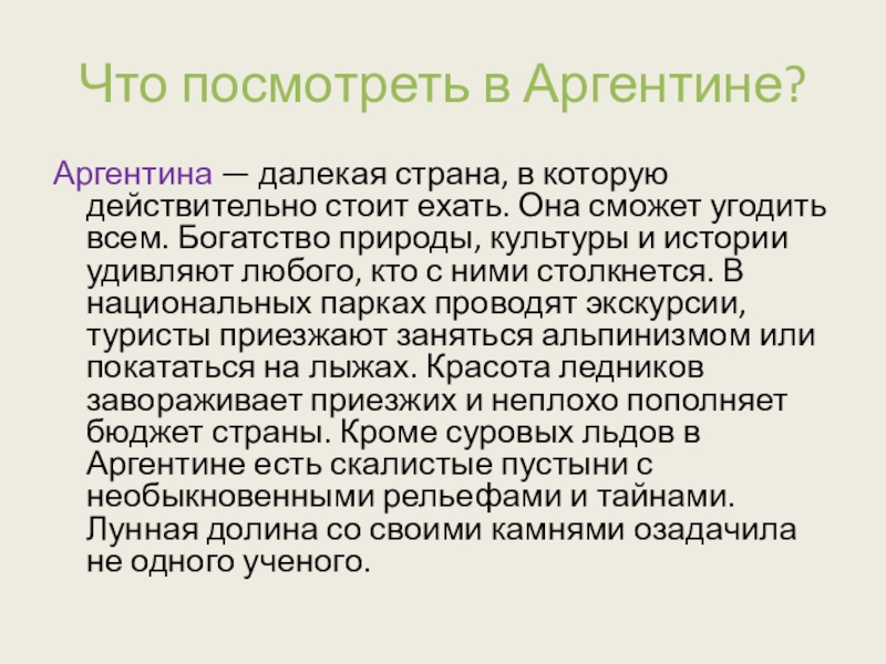 ехать. Она сможет угодить всем. Богатство природы, культуры и истории удивляют любого, кто с ними столкнется. В национальных парках проводят экскурсии, туристы приезжают заняться альпинизмом или покататься на лыжах. Красота ледников завораживает приезжих и неплохо пополняет бюджет страны. Кроме суровых льдов в Аргентине есть скалистые пустыни с необыкновенными рельефами и тайнами. Лунная долина со своими камнями озадачила не одного ученого.