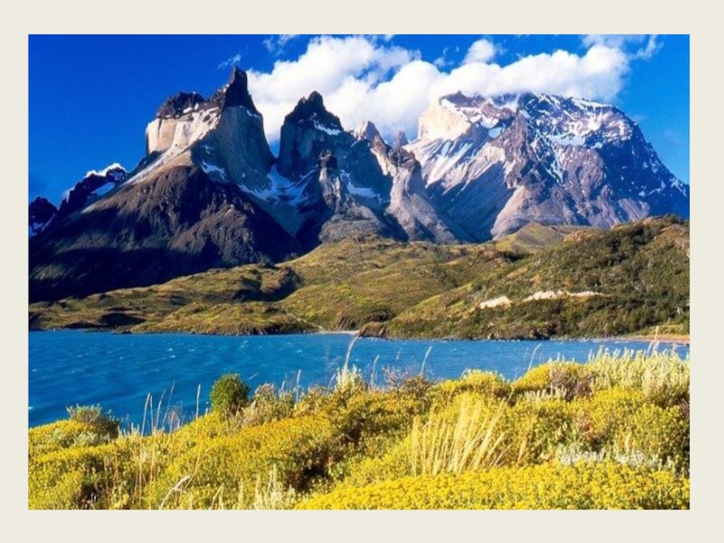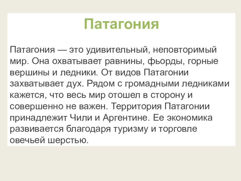 вершины и ледники. От видов Патагонии захватывает дух. Рядом с громадными ледниками кажется, что весь мир отошел в сторону и совершенно не важен. Территория Патагонии принадлежит Чили и Аргентине. Ее экономика развивается благодаря туризму и торговле овечьей шерстью.