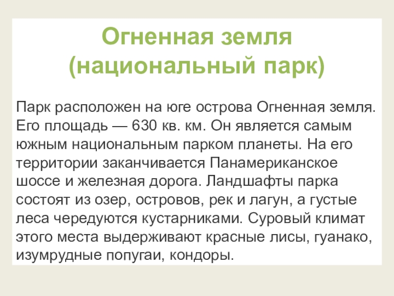 площадь — 630 кв. км. Он является самым южным национальным парком планеты. На его территории заканчивается Панамериканское шоссе и железная дорога. Ландшафты парка состоят из озер, островов, рек и лагун, а густые леса чередуются кустарниками. Суровый климат этого места выдерживают красные лисы, гуанако, изумрудные попугаи, кондоры.