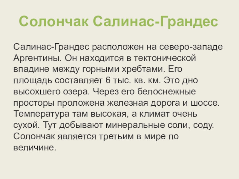 между горными хребтами. Его площадь составляет 6 тыс. кв. км. Это дно высохшего озера. Через его белоснежные просторы проложена железная дорога и шоссе. Температура там высокая, а климат очень сухой. Тут добывают минеральные соли, соду. Солончак является третьим в мире по величине.