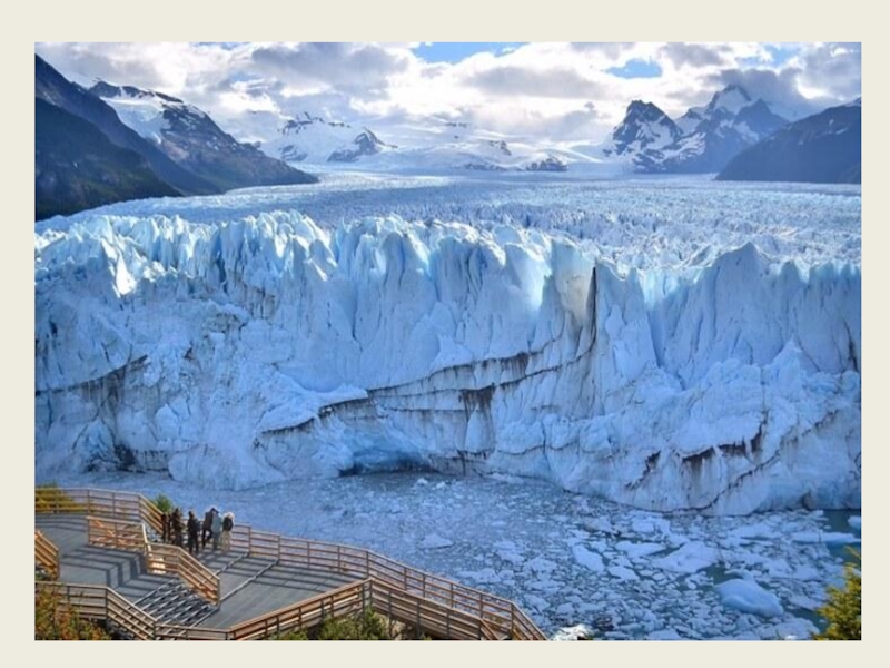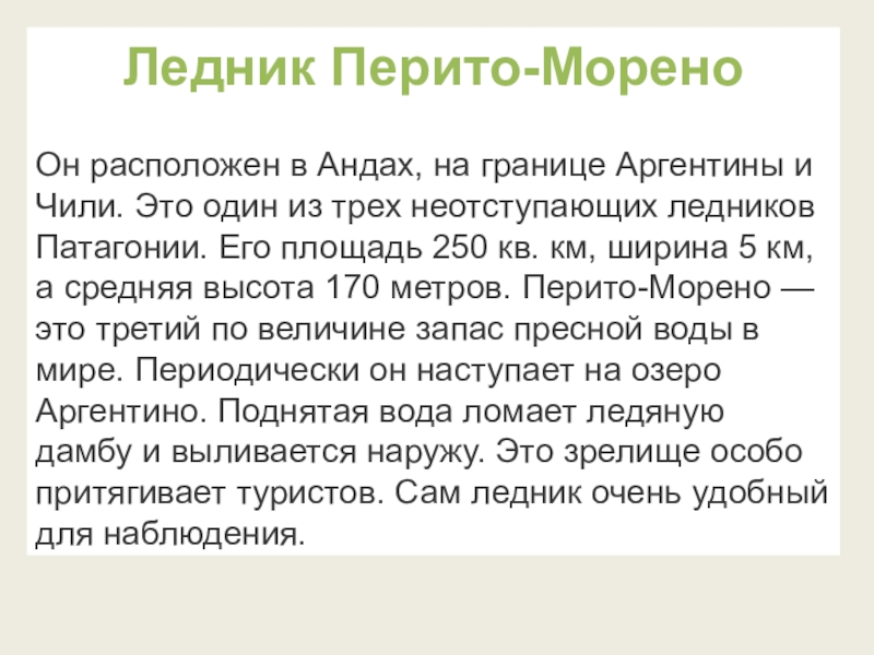один из трех неотступающих ледников Патагонии. Его площадь 250 кв. км, ширина 5 км, а средняя высота 170 метров. Перито-Морено — это третий по величине запас пресной воды в мире. Периодически он наступает на озеро Аргентино. Поднятая вода ломает ледяную дамбу и выливается наружу. Это зрелище особо притягивает туристов. Сам ледник очень удобный для наблюдения.