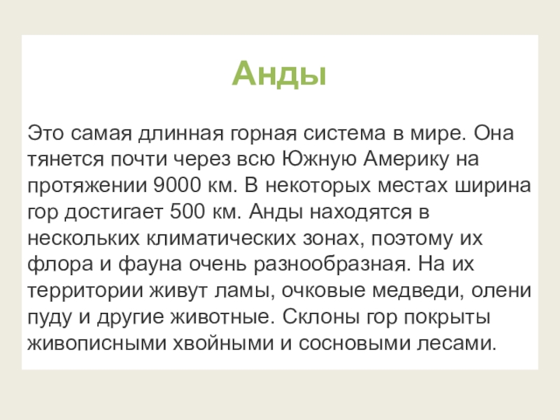 всю Южную Америку на протяжении 9000 км. В некоторых местах ширина гор достигает 500 км. Анды находятся в нескольких климатических зонах, поэтому их флора и фауна очень разнообразная. На их территории живут ламы, очковые медведи, олени пуду и другие животные. Склоны гор покрыты живописными хвойными и сосновыми лесами.