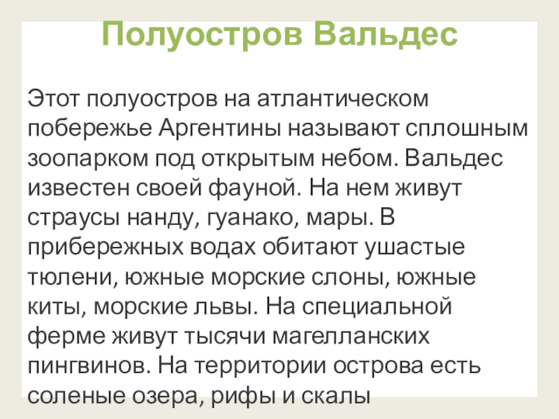 открытым небом. Вальдес известен своей фауной. На нем живут страусы нанду, гуанако, мары. В прибережных водах обитают ушастые тюлени, южные морские слоны, южные киты, морские львы. На специальной ферме живут тысячи магелланских пингвинов. На территории острова есть соленые озера, рифы и скалы