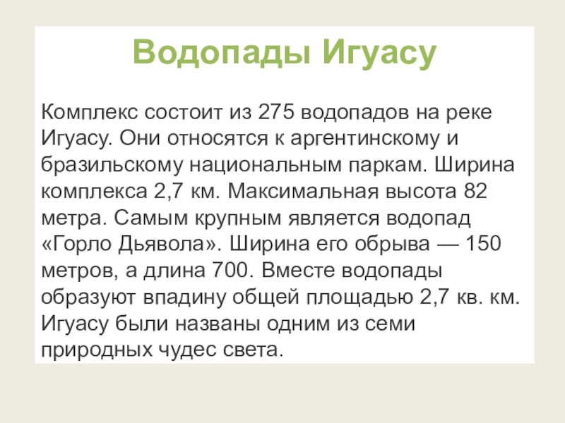 к аргентинскому и бразильскому национальным паркам. Ширина комплекса 2,7 км. Максимальная высота 82 метра. Самым крупным является водопад «Горло Дьявола». Ширина его обрыва — 150 метров, а длина 700. Вместе водопады образуют впадину общей площадью 2,7 кв. км. Игуасу были названы одним из семи природных чудес света.