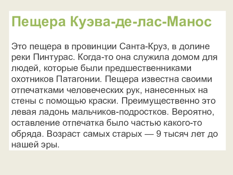 Это пещера в провинции Санта-Круз, в долине реки Пинтурас. Когда-то