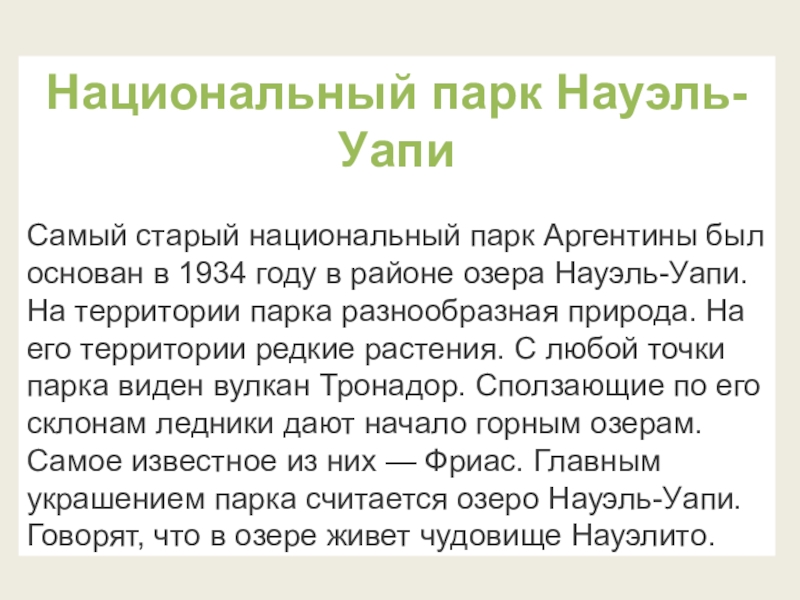 году в районе озера Науэль-Уапи. На территории парка разнообразная природа. На его территории редкие растения. С любой точки парка виден вулкан Тронадор. Сползающие по его склонам ледники дают начало горным озерам. Самое известное из них — Фриас. Главным украшением парка считается озеро Науэль-Уапи. Говорят, что в озере живет чудовище Науэлито.