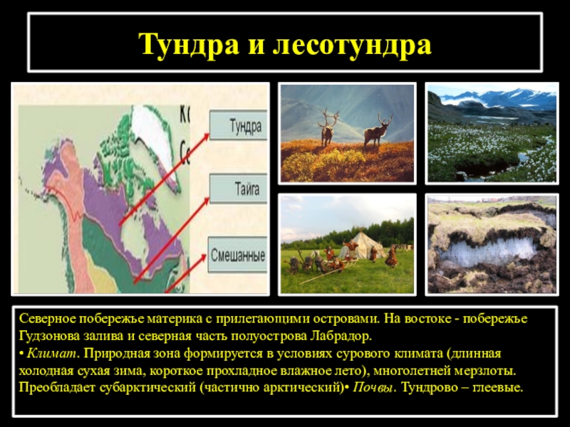 • Климат. Природная зона формируется в условиях сурового климата (длинная холодная сухая зима, короткое прохладное влажное лето), многолетней мерзлоты. Преобладает субарктический (частично арктический)• Почвы. Тундрово – глеевые.
