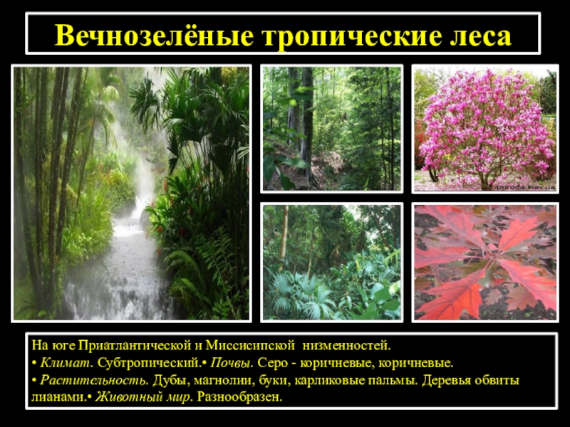 • Растительность. Дубы, магнолии, буки, карликовые пальмы. Деревья обвиты лианами.• Животный мир. Разнообразен.