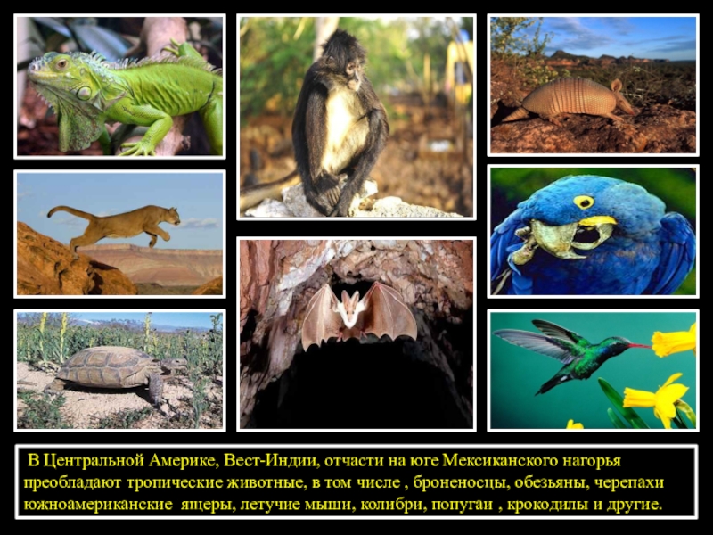 животные, в том числе , броненосцы, обезьяны, черепахи южноамериканские ящеры, летучие мыши, колибри, попугаи , крокодилы и другие.