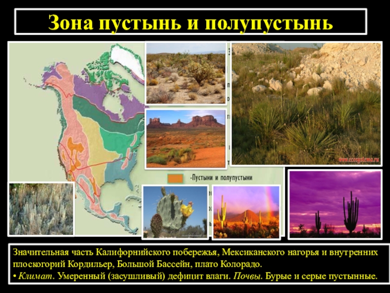 • Климат. Умеренный (засушливый) дефицит влаги. Почвы. Бурые и серые пустынные.