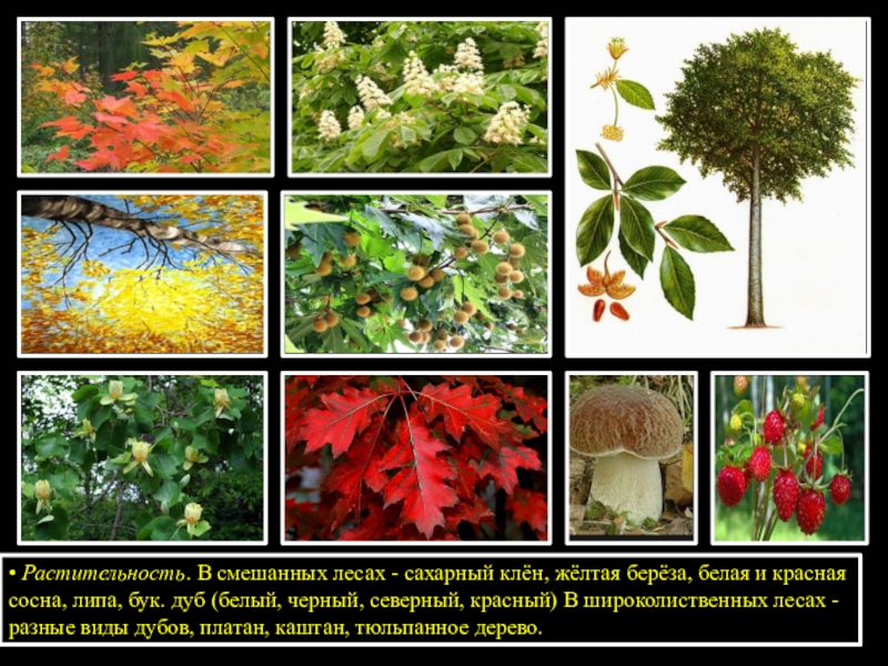 Слайд 14• Растительность. В смешанных лесах - сахарный клён, жёлтая берёза, белая и