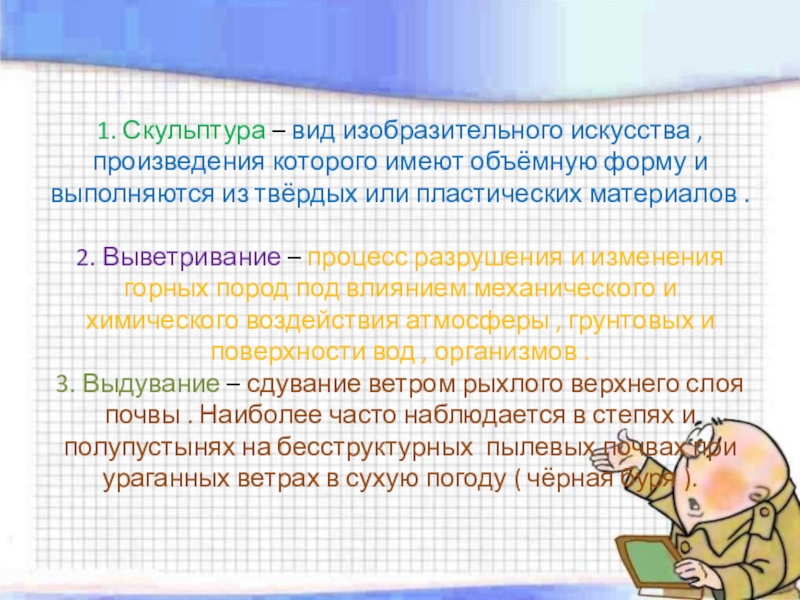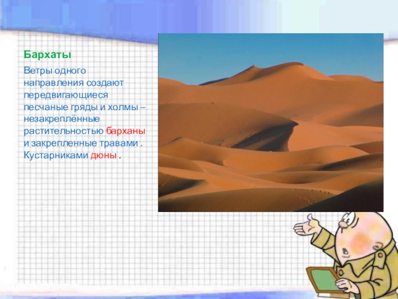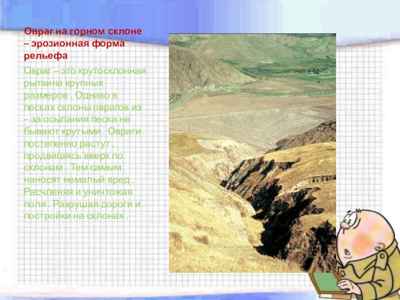 Овраг – это крутосклонная рытвина крупных размеров . Однако в песках склоны оврагов из – за осыпания песка не бывают крутыми . Овраги постепенно растут , продвигаясь вверх по склонам . Тем самым наносят немалый вред . Расчленяя и уничтожая поля . Разрушая дороги и постройки на склонах .