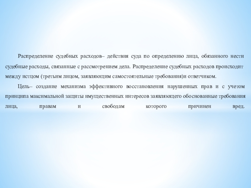 Слайд 2 Распределение судебных расходов– действия суда по определению лица, обязанного нести судебные
