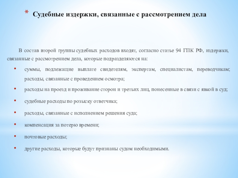 Слайд 8Судебные издержки, связанные с рассмотрением дела