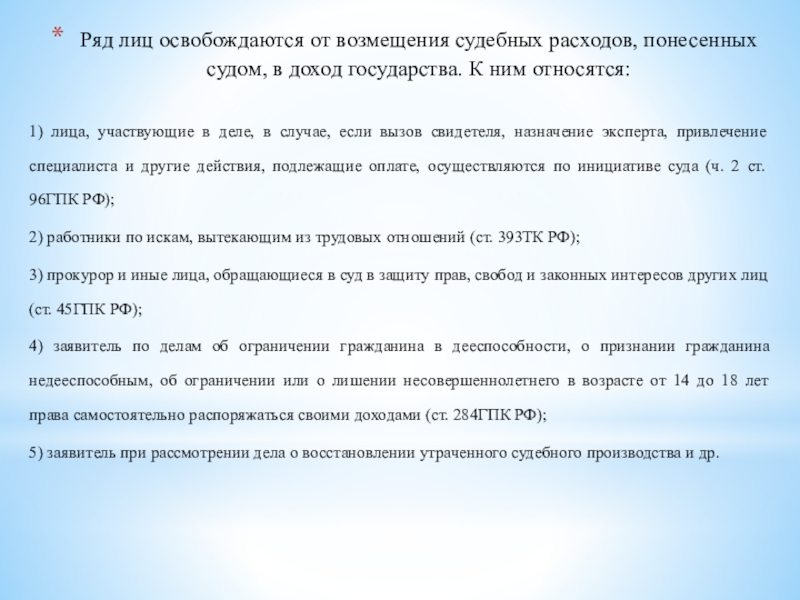 Слайд 6Ряд лиц освобождаются от возмещения судебных расходов, понесенных судом, в доход государства.