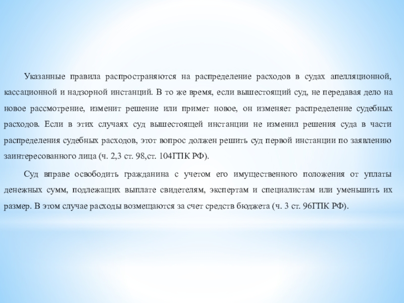 Слайд 4 Указанные правила распространяются на распределение расходов в судах апелляционной, кассационной и