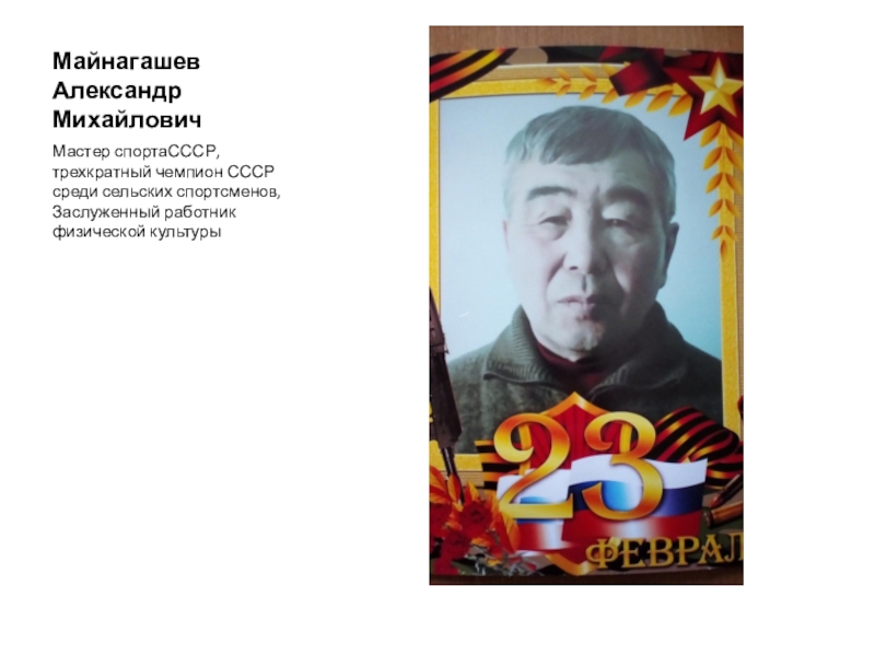 Майнагашев Александр МихайловичМастер спортаСССР, трехкратный чемпион СССР среди сельских спортсменов,Заслуженный работник физической культуры