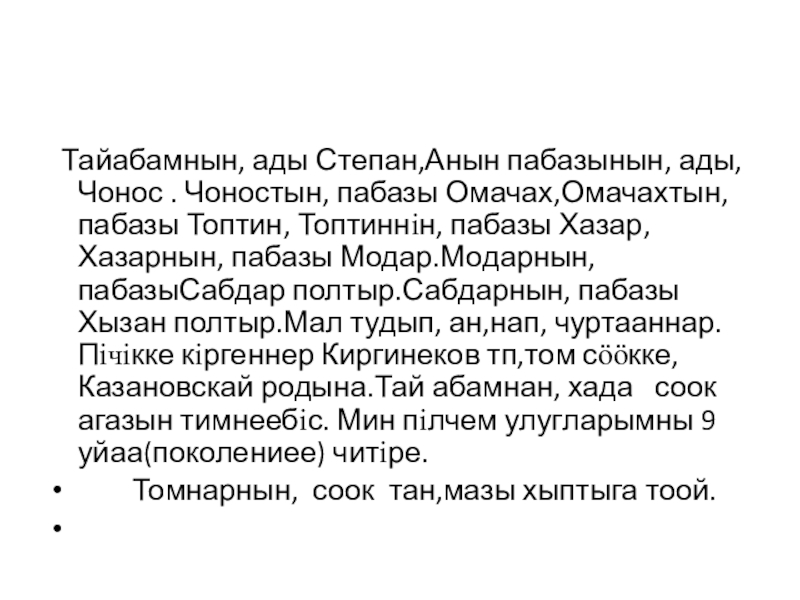 Тайабамнын, ады Степан,Анын пабазынын, ады,Чонос . Чоностын, пабазы Омачах,Омачахтын, пабазы Топтин, Топтиннiн, пабазы Хазар, Хазарнын, пабазы Модар.Модарнын, пабазыСабдар полтыр.Сабдарнын, пабазы Хызан полтыр.Мал тудып, ан,нап, чуртааннар. Пiчiкке кiргеннер Киргинеков тп,том сööкке,Казановскай родына.Тай абамнан, хада соок