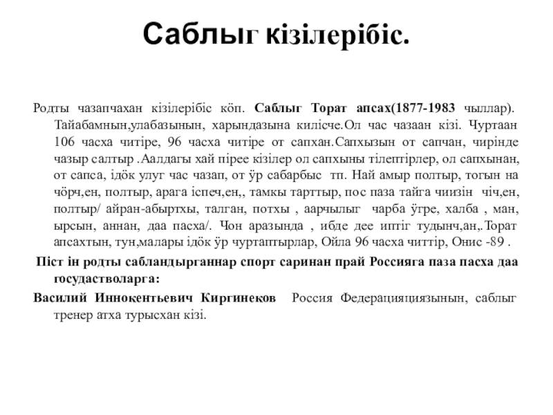 Саблыг кiзiлерiбiс. Родты чазапчахан кiзiлерiбiс кöп. Саблыг Торат апсах(1877-1983 чыллар). Тайабамнын,улабазынын, харындазына килiсче.Ол час чазаан кiзi. Чуртаан