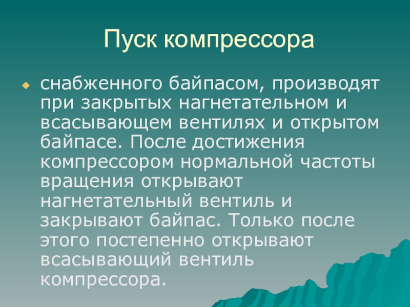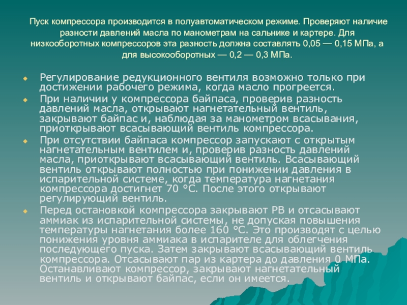 При отсутствии байпаса компрессор запускают с открытым нагнетательным вентилем и, проверив разность давлений масла, приоткрывают всасывающий вентиль. Всасывающий вентиль открывают полностью при понижении давления в испарительной системе, когда температура нагнетания компрессора достигнет 70 °С. После этого открывают регулирующий вентиль.