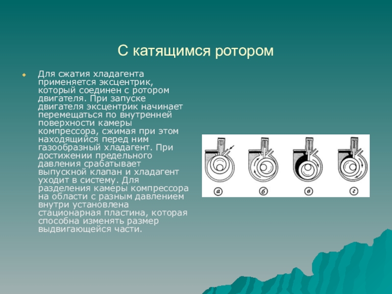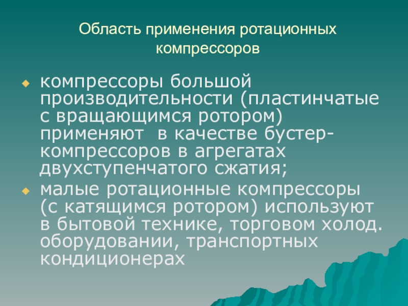 малые ротационные компрессоры (с катящимся ротором) используют в бытовой технике, торговом холод.оборудовании, транспортных кондиционерах